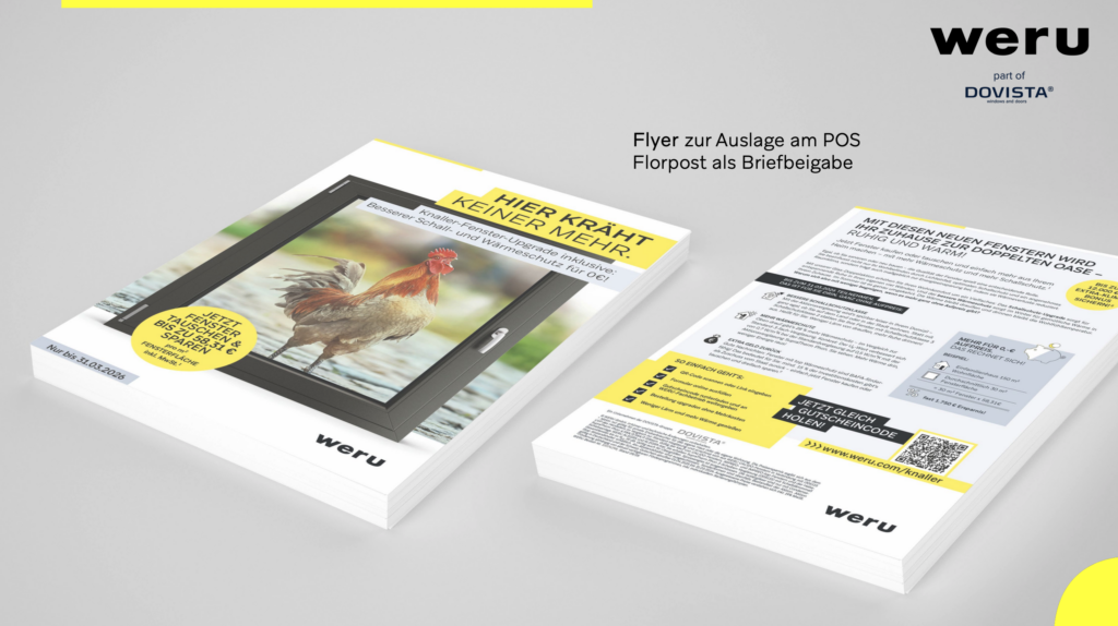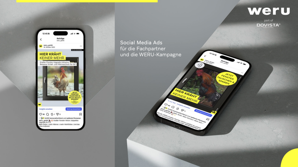 Lärm durch Nachbarn, Straßenverkehr oder spielende Kinder ist einer der stärksten Alltags-Stressfaktoren in den eigenen vier Wänden. Gleichzeitig ist Schallschutz im Entscheidungsprozess für Fenster häufig unterbewertet. Solange es kein Problem gibt, wird das Thema ignoriert. Die Kampagne bricht bewusst mit klassischen Energiespar-oder Technikmotiven und setzt auf emotionale, teilweise humorvolle Alltagsbilder. Das WERU-Fenster wird zum Symbol für Ruhe und Wohnqualität. Der Aktionsclaim „Besserer Schall-und Wärmeschutz für 0 €“ übersetzt diese Emotionalität in ein klares, niedrigschwelliges Verkaufsargument.
