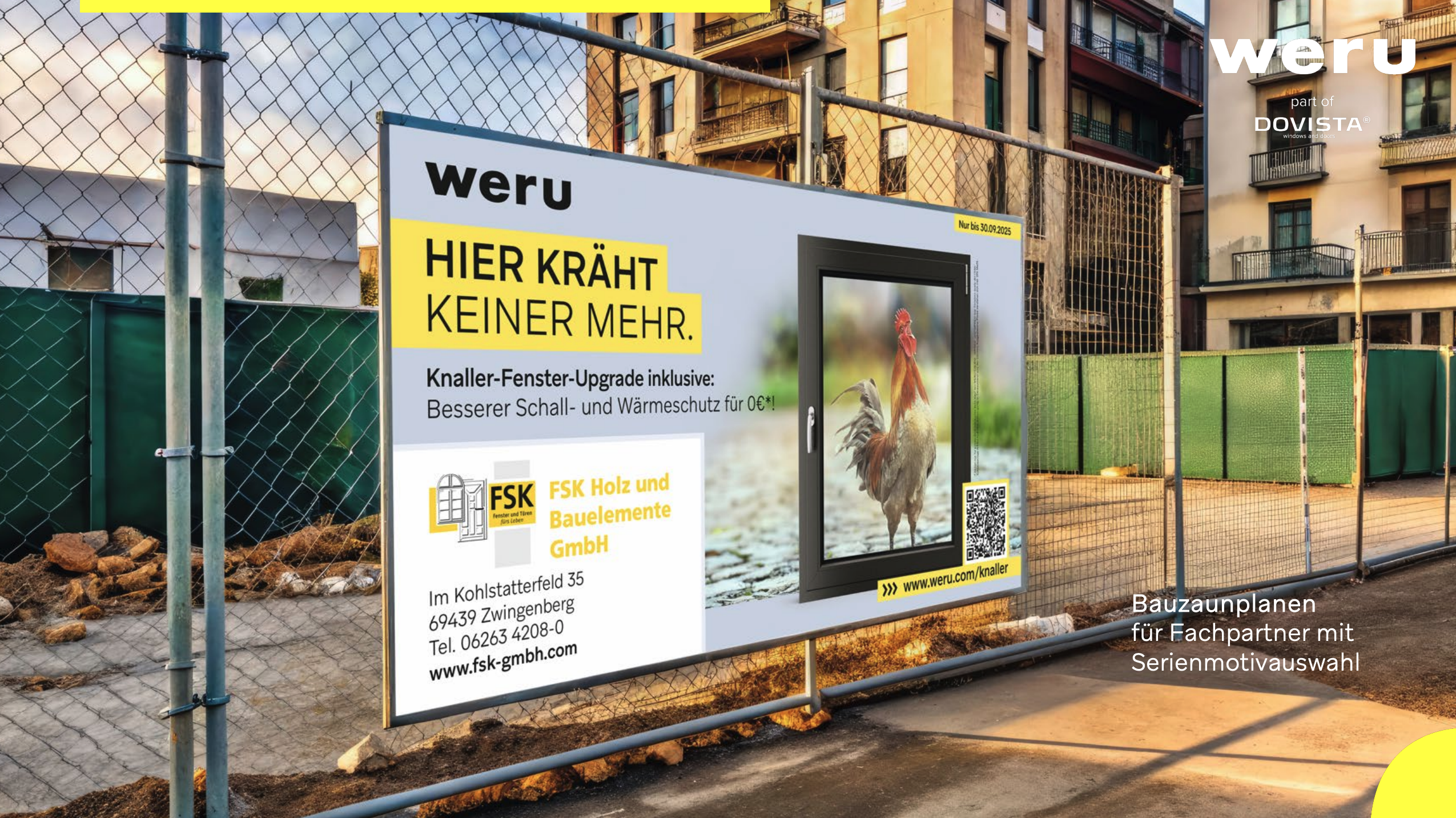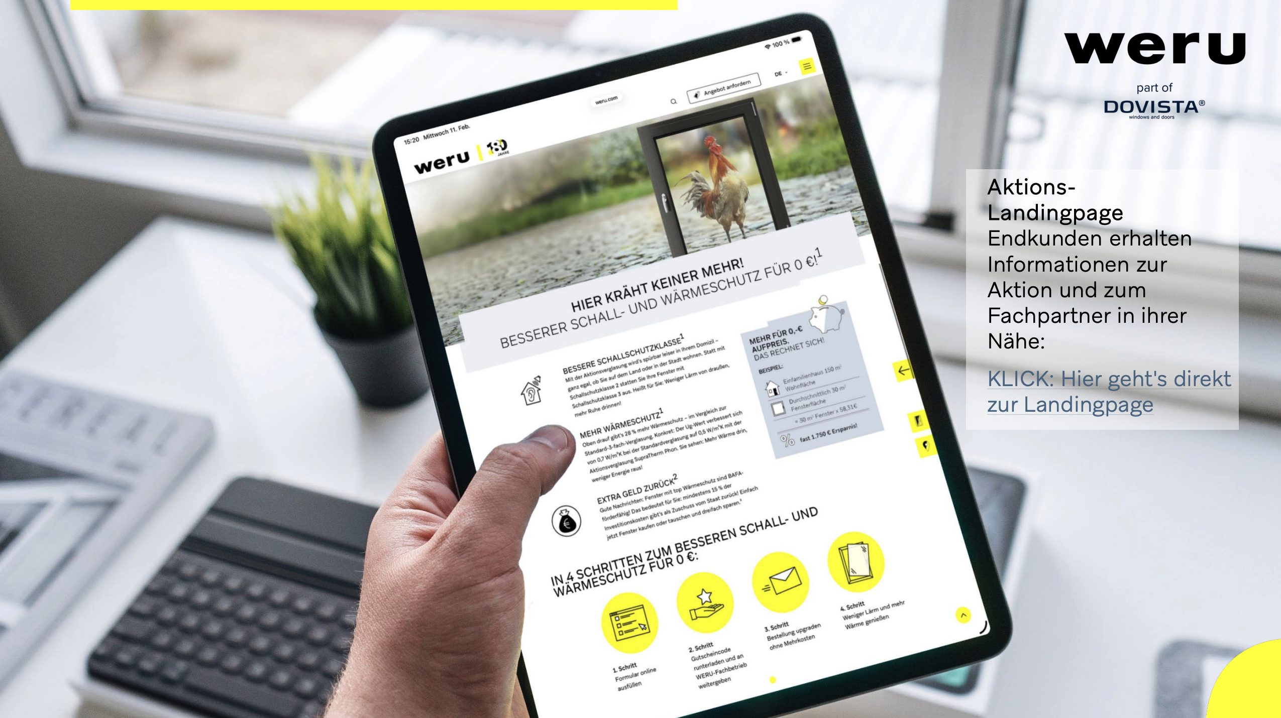 Lärm durch Nachbarn, Straßenverkehr oder spielende Kinder ist einer der stärksten Alltags-Stressfaktoren in den eigenen vier Wänden. Gleichzeitig ist Schallschutz im Entscheidungsprozess für Fenster häufig unterbewertet. Solange es kein Problem gibt, wird das Thema ignoriert. Die Kampagne bricht bewusst mit klassischen Energiespar-oder Technikmotiven und setzt auf emotionale, teilweise humorvolle Alltagsbilder. Das WERU-Fenster wird zum Symbol für Ruhe und Wohnqualität. Der Aktionsclaim „Besserer Schall-und Wärmeschutz für 0 €“ übersetzt diese Emotionalität in ein klares, niedrigschwelliges Verkaufsargument.