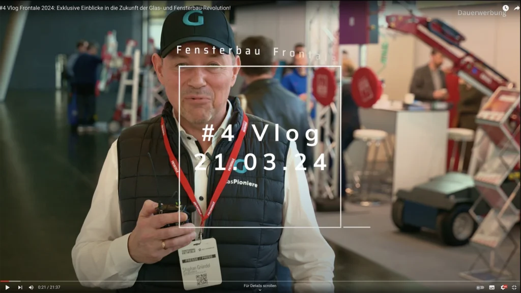 Für unseren Kanal „GlasPioniere“ haben wir auf der Fensterbau Frontale 2024 einen Vlog gedreht und eine Auswahl an Menschen und Unternehmen vorgestellt, die interessante Produkte für Glas/Fenster/Fassaden im Bereich der Glasbranche anbieten bzw. dort aktiv sind, die Staatliche Fachschule für Bau- und Glasbautechnik Vilshofen, Firma Rottler und Rüdiger Langenzenn, Firma Uplifter aus Nabburg und Fa. Hahn Lamellenfenster Stockstadt a. Main.